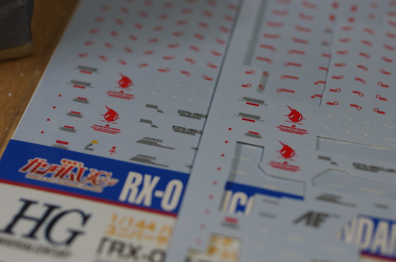 このシールドの真ん中あたりにユニコーンガンダムのエンブレムを貼る訳なんですが、実は、ガンダムデカールについているユニコーンのエンブレムは赤色の物が二つしかついていないんですが、シールドは4枚ありまして、予備も入れると5枚あるんです。できたら予備以外の4枚にユニコーンガンダムの赤エンブレムを貼りたい!ということで、フェネクス用に買っておいたガンダムデカールの出番です。